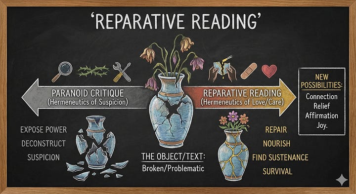 Ήταν λοιπόν ένα γόνιμο ΣΚ, που μας έδωσε την ευκαιρία να δοκιμάσουμε πως οι πρακτικές αναπλαισίωσης μπορούν να εμπλουτιστούν. Οι νέοι φακοί αυτοί είναι η διάκριση των studium/punctum από τον Roland Barthes, η επικοινωνιακή διάκριση command/report από τον Bateson, η κριτική διεστιακότητα (critical bifocality) των Weiss & Fine, η διπλή περιγραφή από τον Bateson, η συμπονετική ανάγνωση της Kosovsky-Sedgewick, η περιθλαστική ανάγνωση των Haraway & Barad, το διαθεματικό πλαίσιο Social Graces του Burnham (μπορείτε να δείτε μερικές από τις δημιουργημένες με ΑΙ σχετικές διαφάνειες πιο κάτω). Αλλά η μεγάλη διαφοροποίηση από μια ‘τυπική’ αναπλαισίωση ήταν η προβολή της ως μια συν-αισθηματικής λογοπρακτικής, κατά τη Margaret Wetherell, δηλαδή ως μια θεραπευτική τεχνική/πρακτική όπου τα λόγια και το συναίσθημα δι-εμπλέκονται και είναι αξεχώριστα.